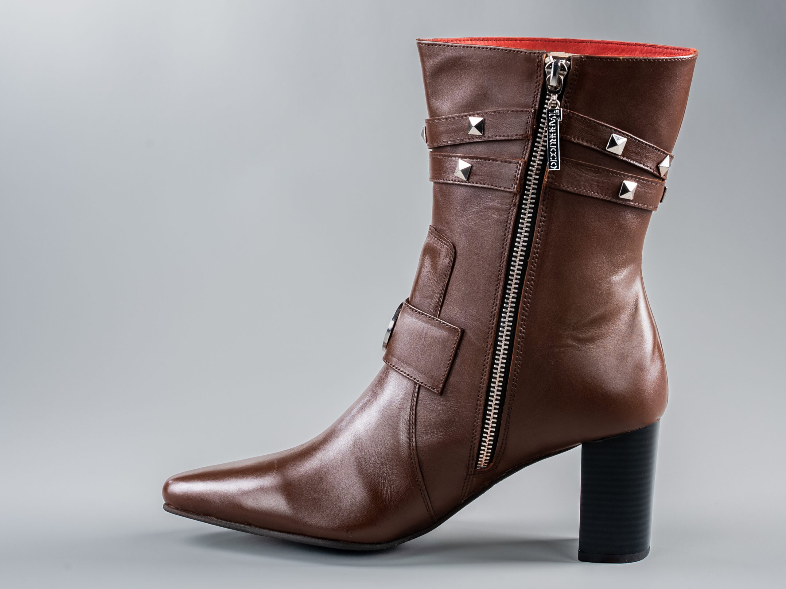 Mid-calf boots with signature studded ankle straps and iconic logo buckle. Full-grain leather with cherry red soft leather lining for 12-14 hour comfort.