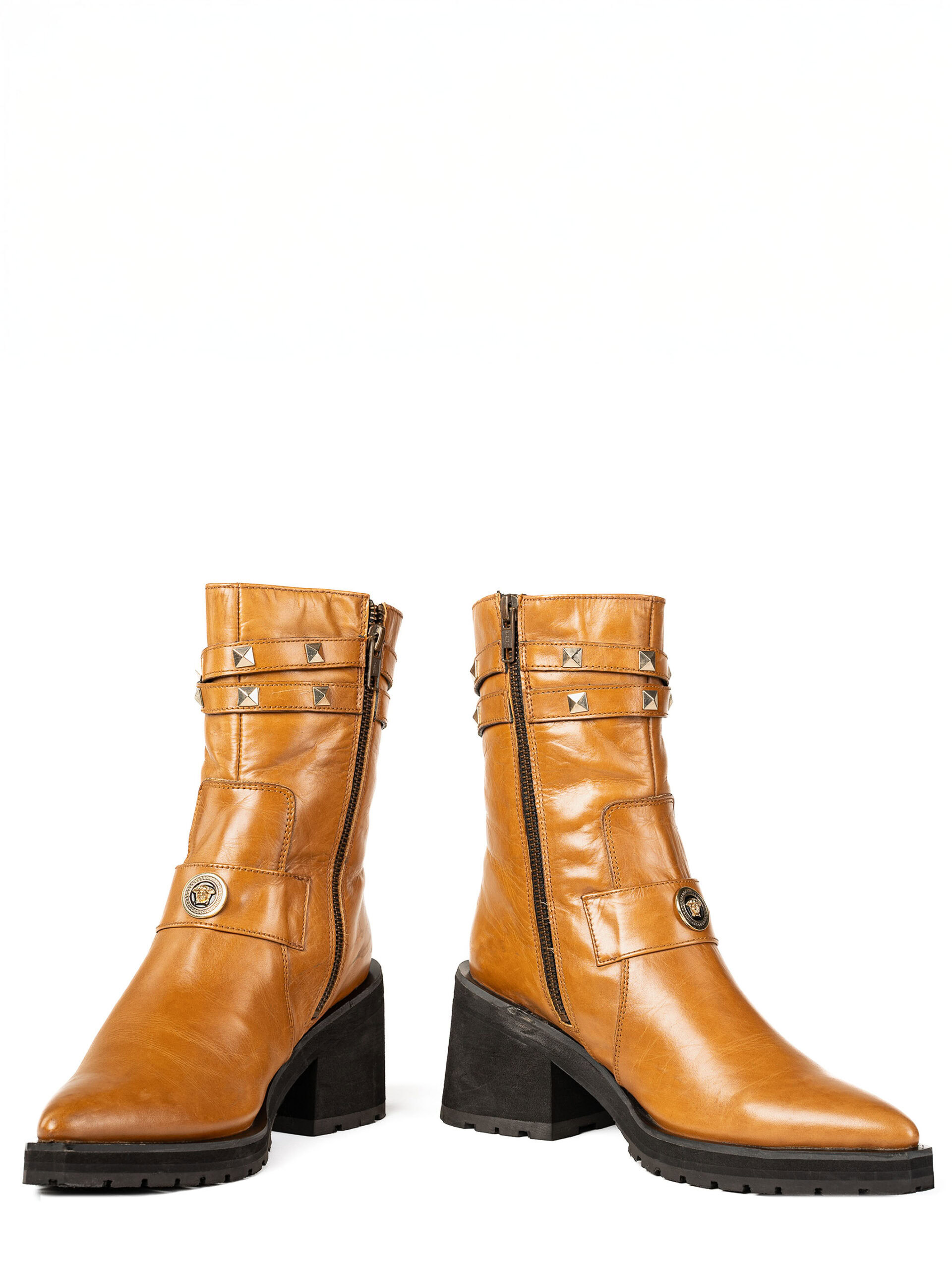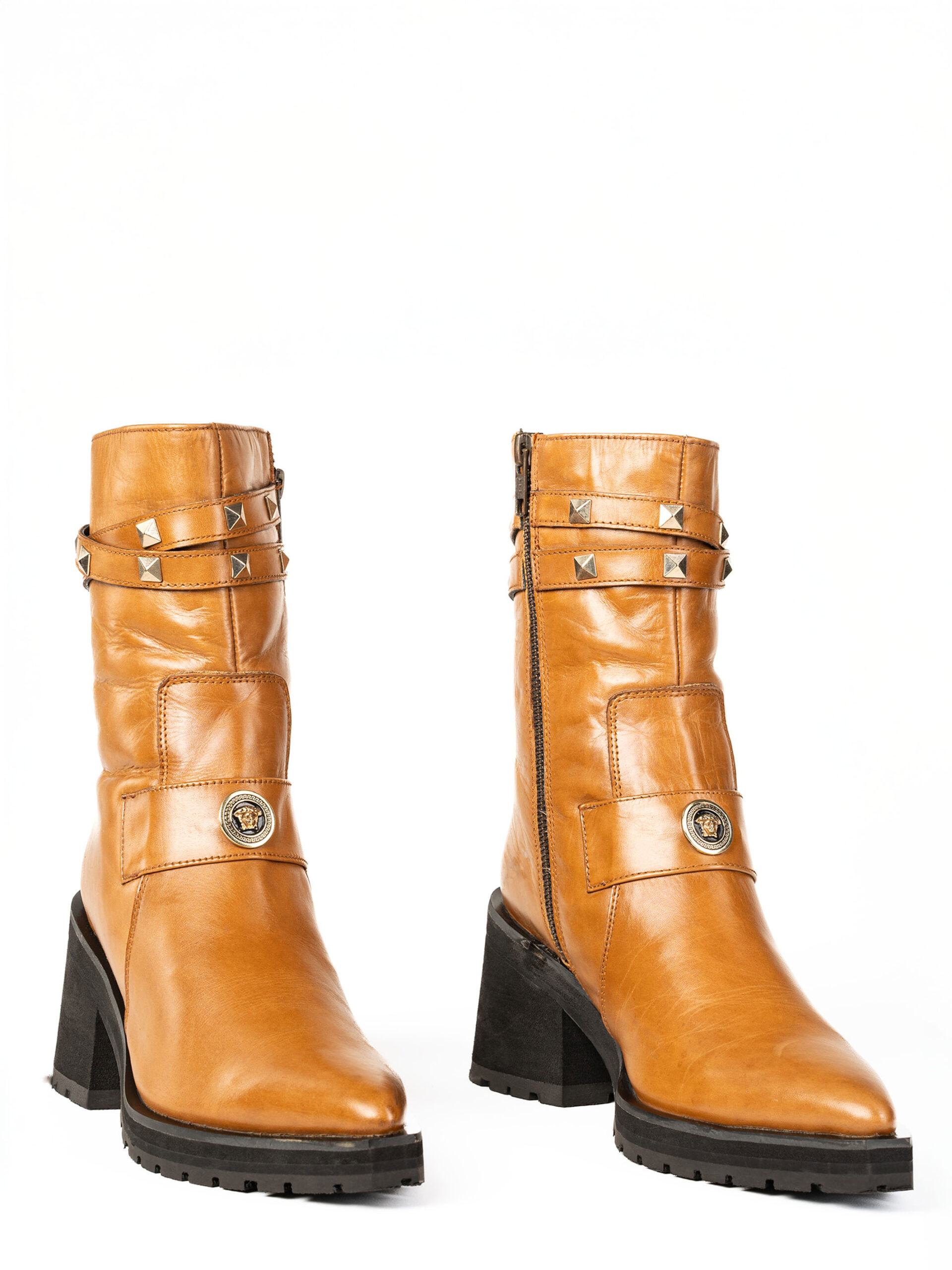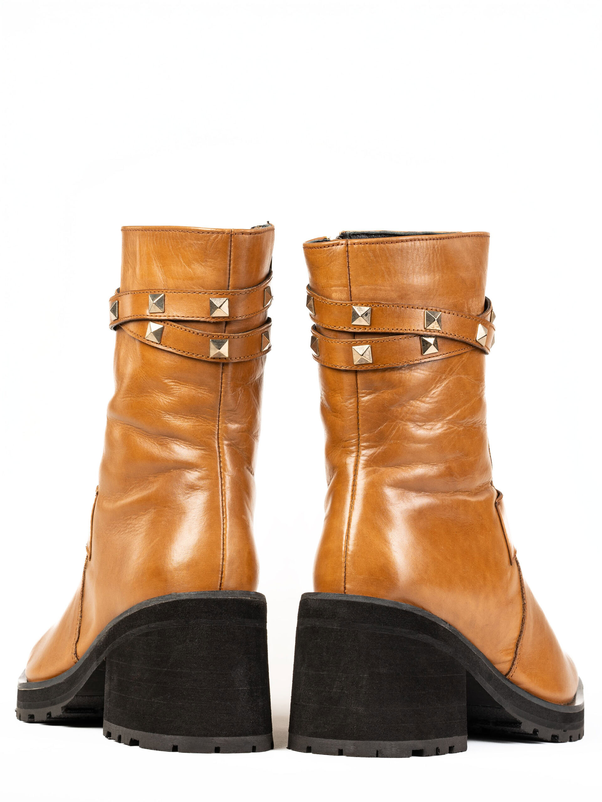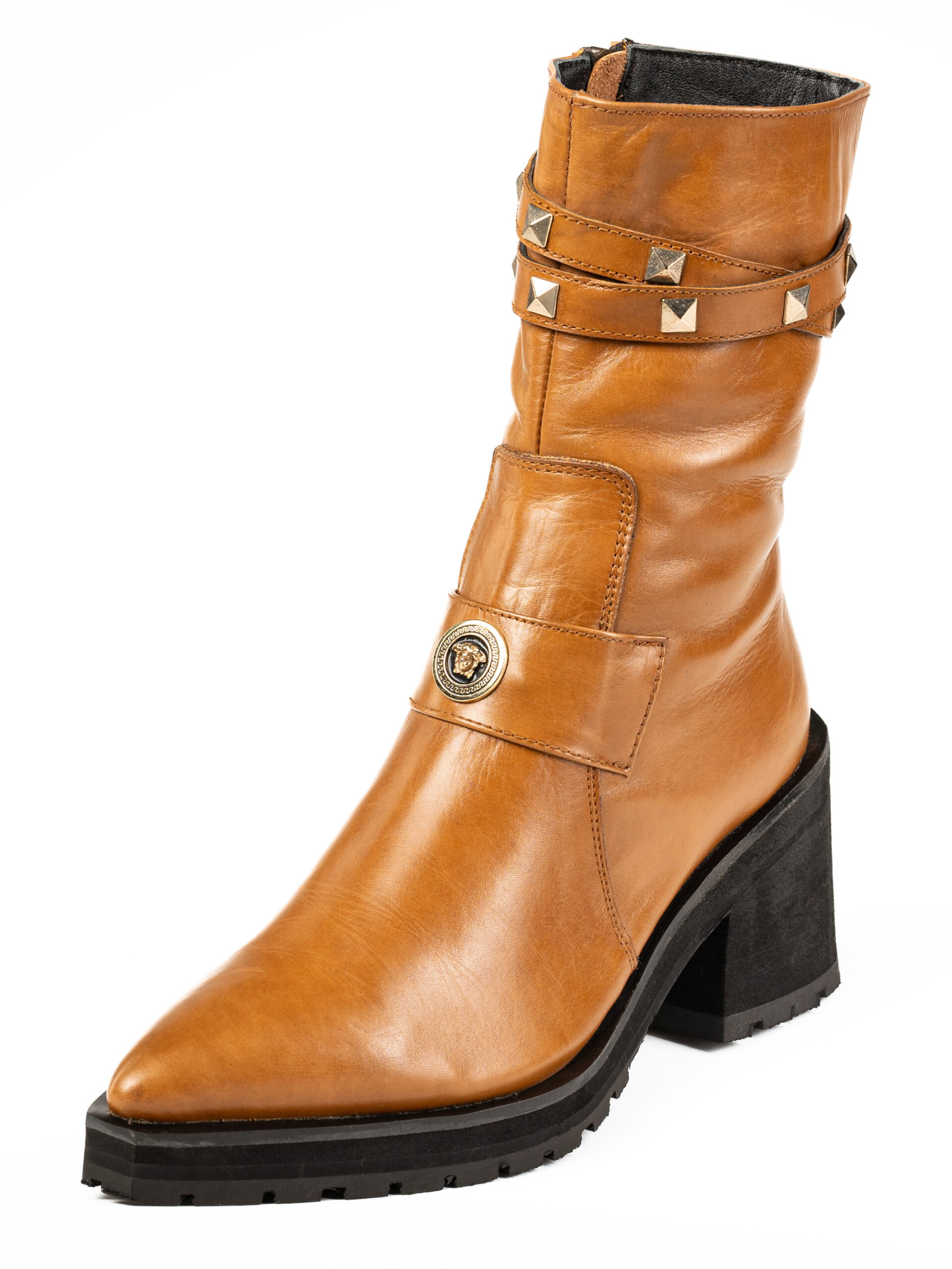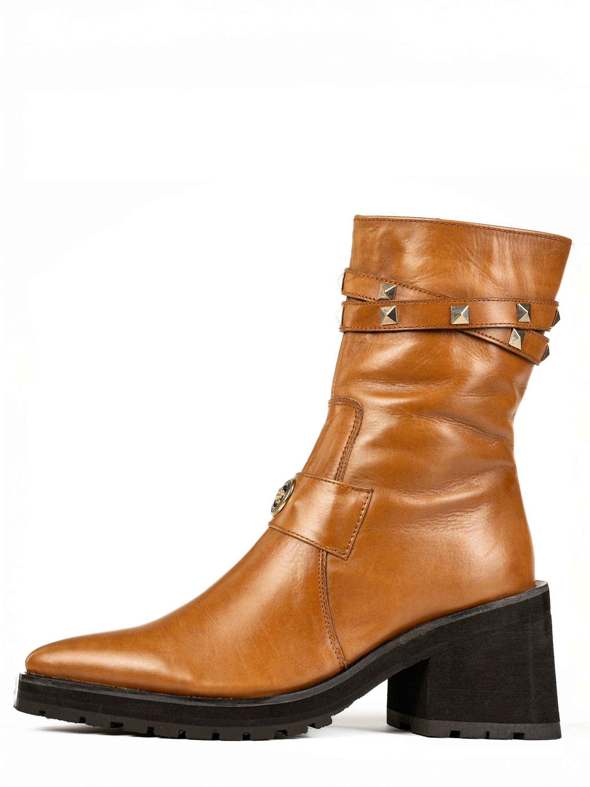 Handcrafted from premium full-grain leather, these boots feature a rich tan hue, enhanced with gold-studded straps for a contemporary edge. The block heel and durable rubber outsole provide excellent stability and traction, making them perfect for both city streets and elevated occasions.